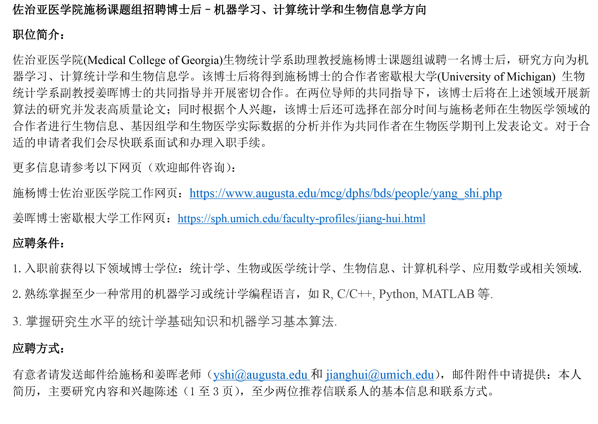 佐治亚医学院(Medical College of Georgia)生物统计学系助理教授施杨博士课题组诚聘一名博士后,研究方向为机器学习、计算统计学和生物信息学。该博士后将得到施杨博士的合作者密歇根大学(University of Michigan) 生物统计学系副教授姜晖博士的共同指导并开展密切合作。在两位导师的共同指导下,该博士后将在上述领域开展新算法的研究并发表高质量论文;同时根据个人兴趣,该博士后还可选择在部分时间与施杨老师在生物医学领域的合作者进行生物信息、基因组学和生物医学实际数据的分析并作为共同作者在生物医学期刊上发表论文。对于合适的申请者我们会尽快联系面试和办理入职手续。